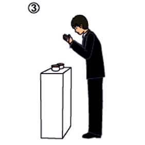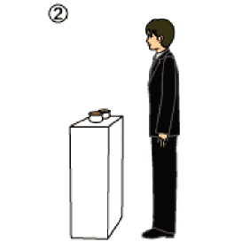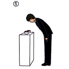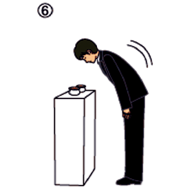 • 焼香台の少し手前で遺族と僧侶に一礼、焼香台の前に進み遺影に一礼します。