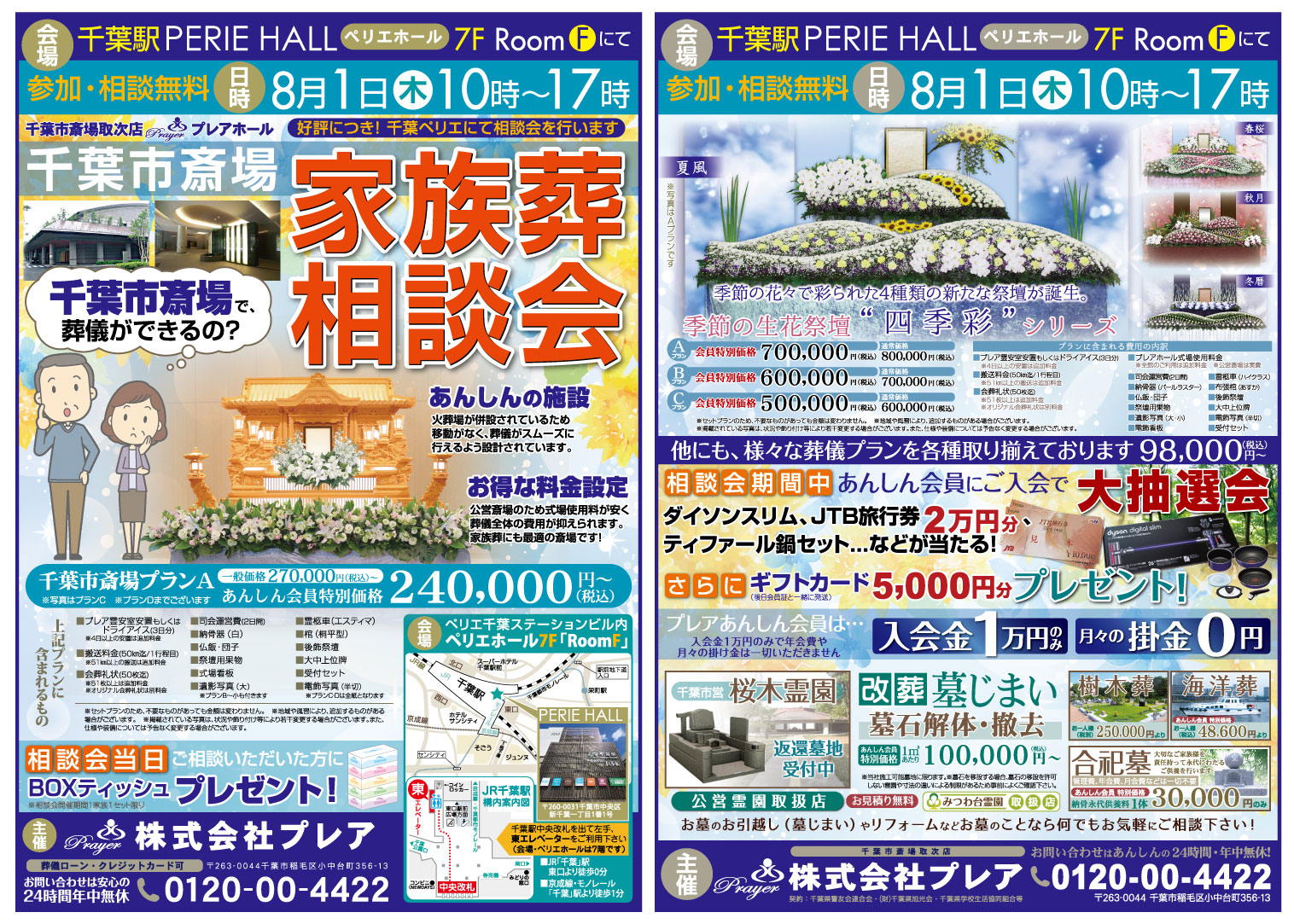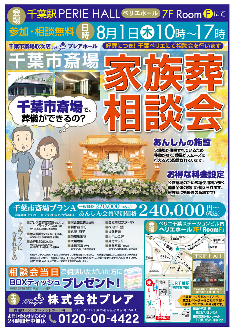 8月1日(木)、ペリエ千葉(千葉ステーションビル)ペリエホール7F/RoomFにて家族葬相談会を行います。