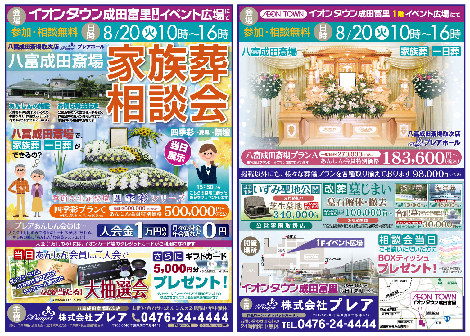8月20日(火)、イオンタウン成田富里1F、イベント広場にて家族葬相談会を行います。