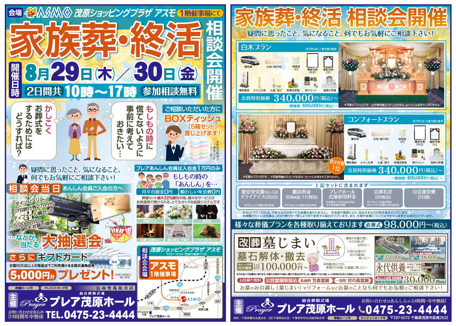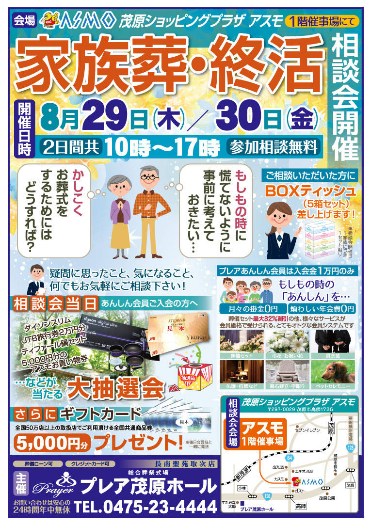 8月29日(木)、30日(金)の二日間、茂原ショッピングプラザ「アスモ」1階催事場にて“家族葬・終活相談会”を行います。