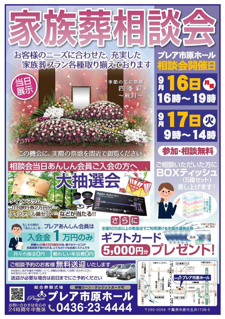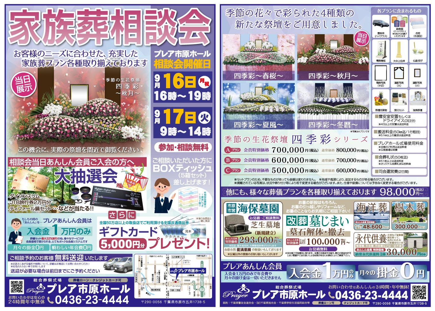 9月16日(月)、17日(火)の二日間、プレア市原ホールにて家族葬相談会を行います。