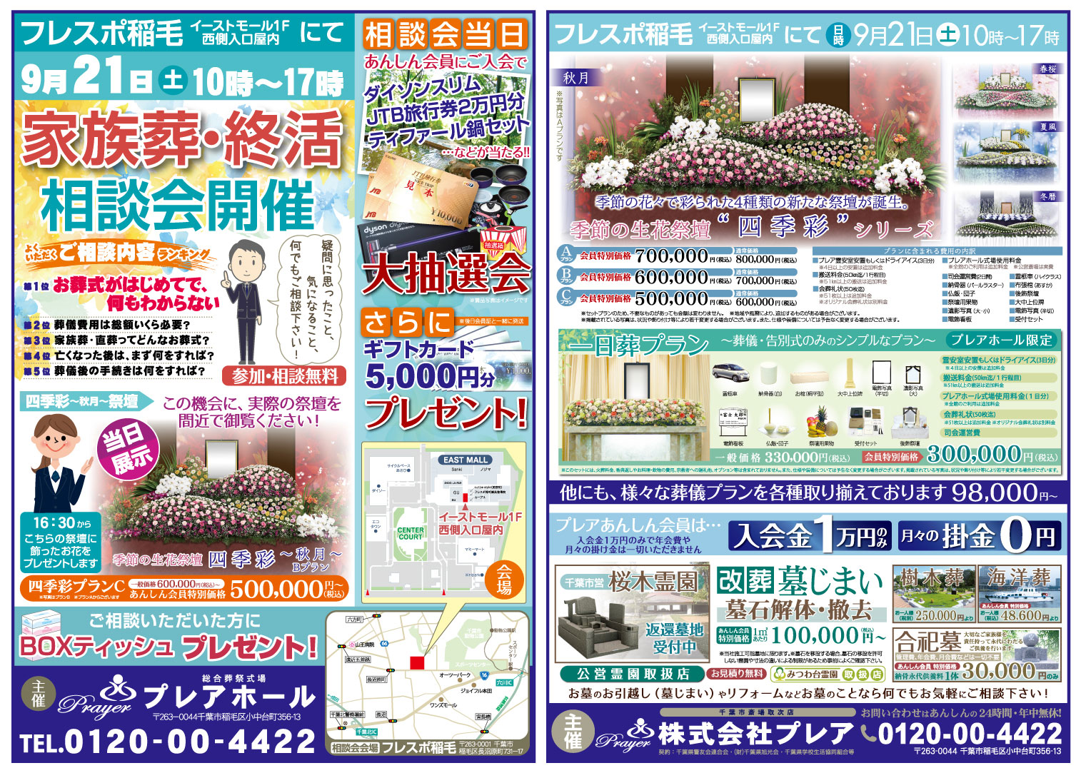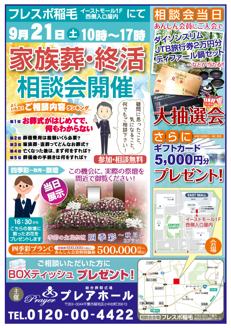 9月21日(土)、フレスポ稲毛 イーストモール1F(西側入口屋内)にて家族葬・終活相談会を行います。