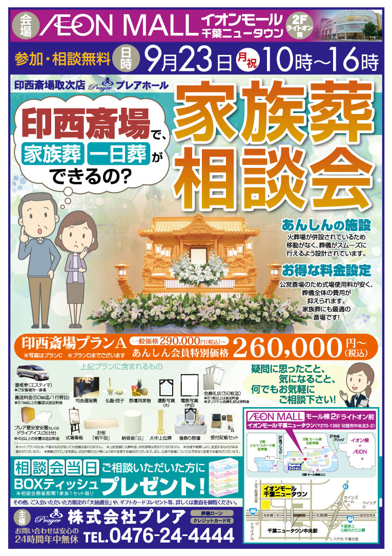 9月23日(月)、イオンモール千葉ニュータウン(モール棟)2Fライトオン前にて家族葬相談会を行います。