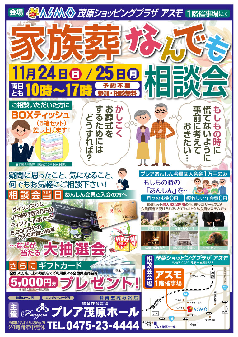 11月24日(日)、25日(月)の二日間、茂原ショッピングプラザ「アスモ」1階催事場にて“家族葬なんでも相談会”を行います。
