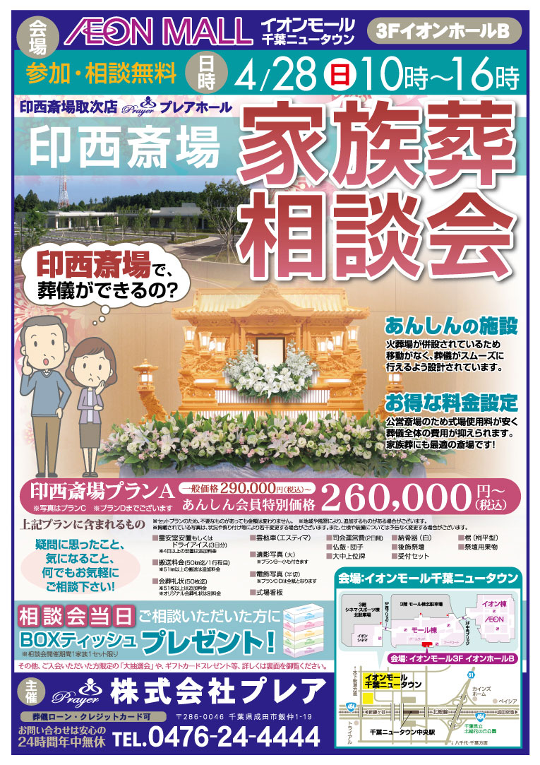 4月28日(日)、イオンモール千葉ニュータウン3F、イオンホールBにて家族葬相談会を行います。
