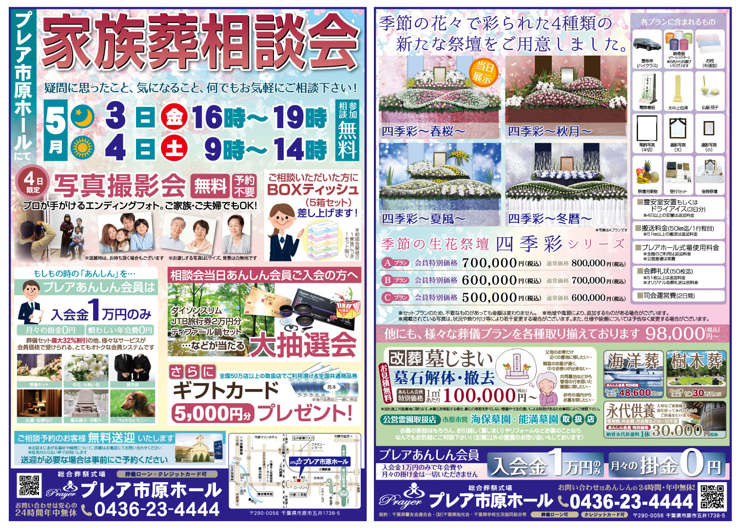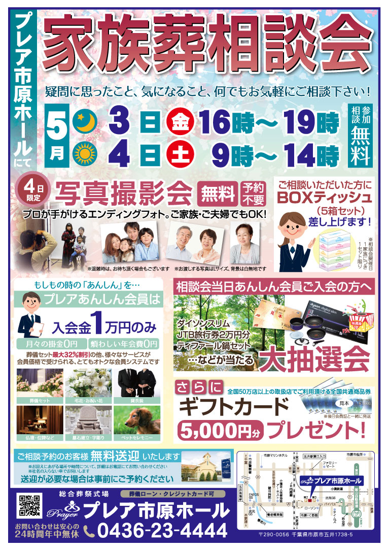 5月3日(金)、4日(土)の二日間、プレア市原ホールにて家族葬相談会を行います。