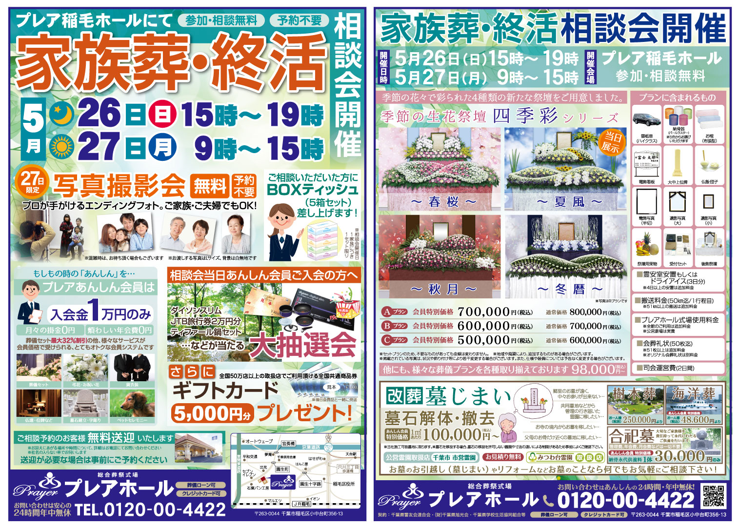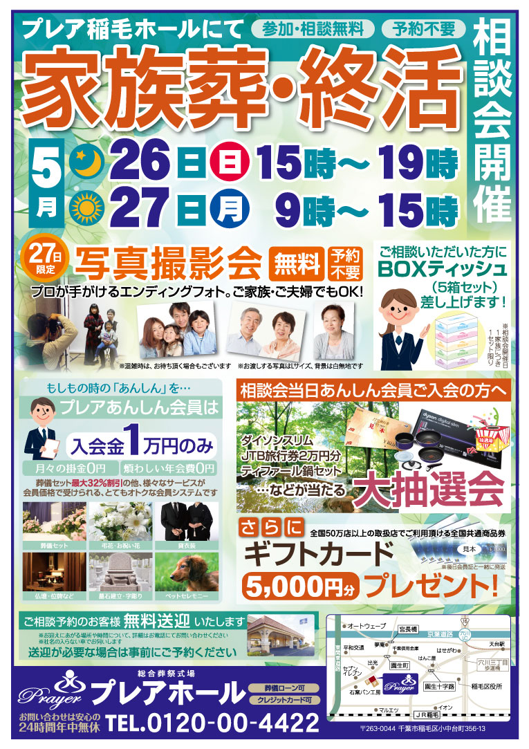 5月26日(日)、27日(月)の二日間、プレア稲毛ホールにて家族葬・終活相談会を行います。