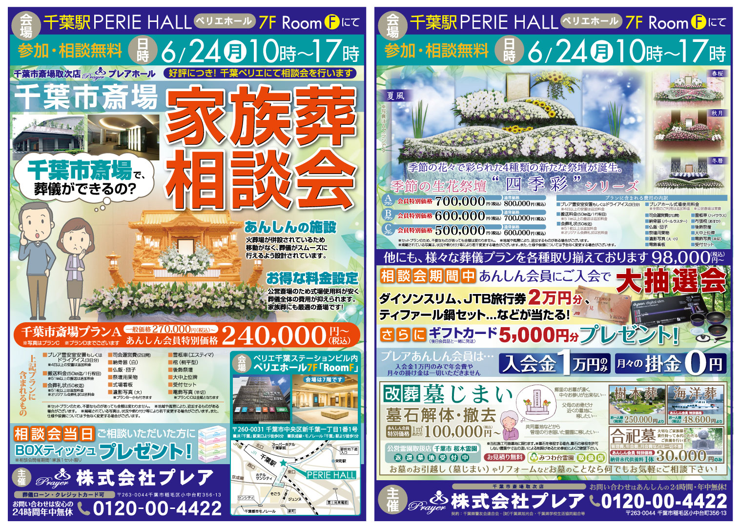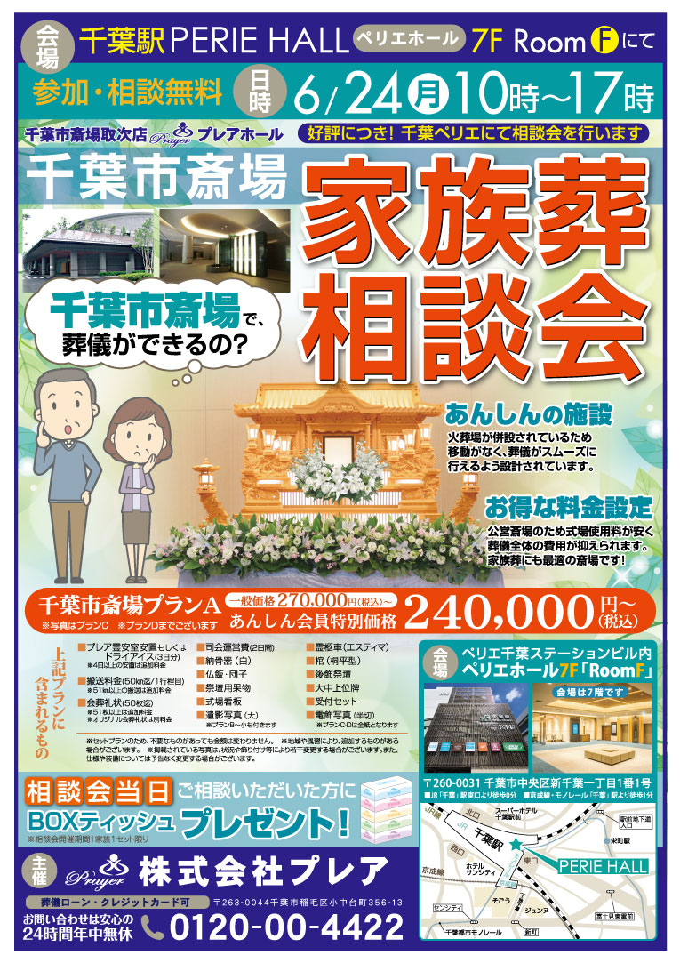 6月24日(月)、ペリエ千葉(千葉ステーションビル)ペリエホール7F/RoomFにて家族葬相談会を行います。
