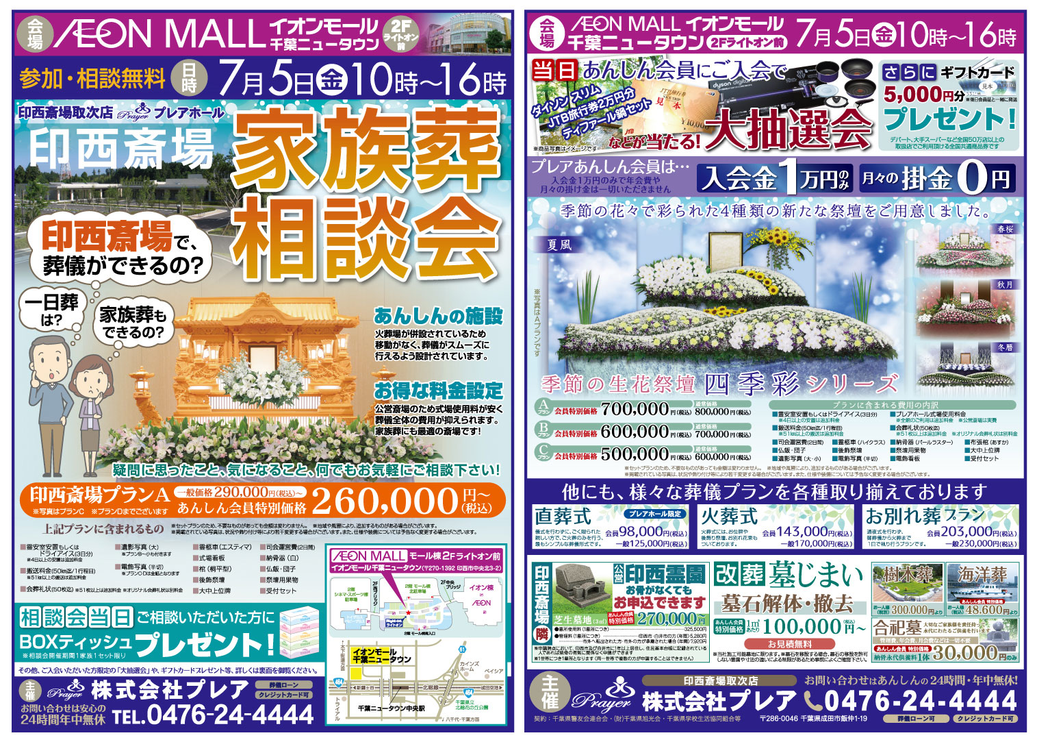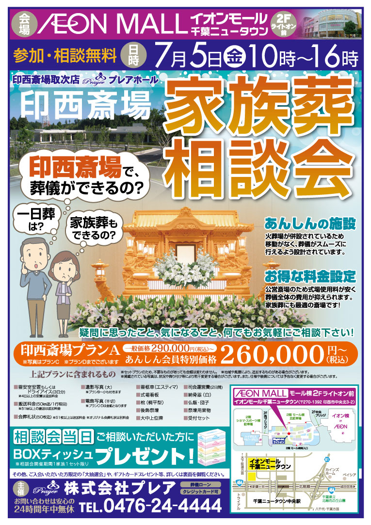7月5日(金)、イオンモール千葉ニュータウン(モール棟)2Fライトオン前にて家族葬相談会を行います。