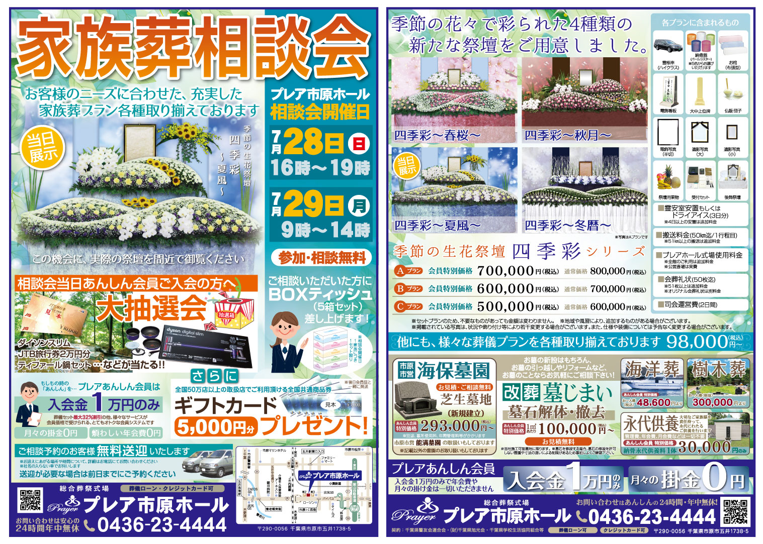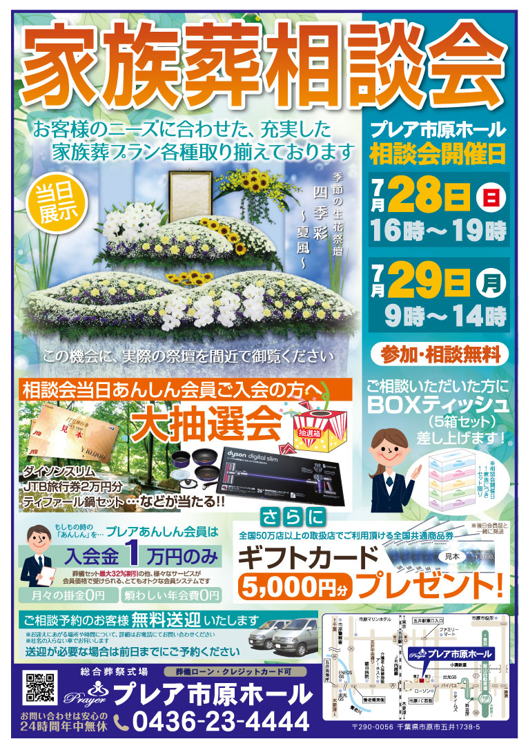 7月28日(日)、29日(月)の二日間、プレア市原ホールにて家族葬相談会を行います。