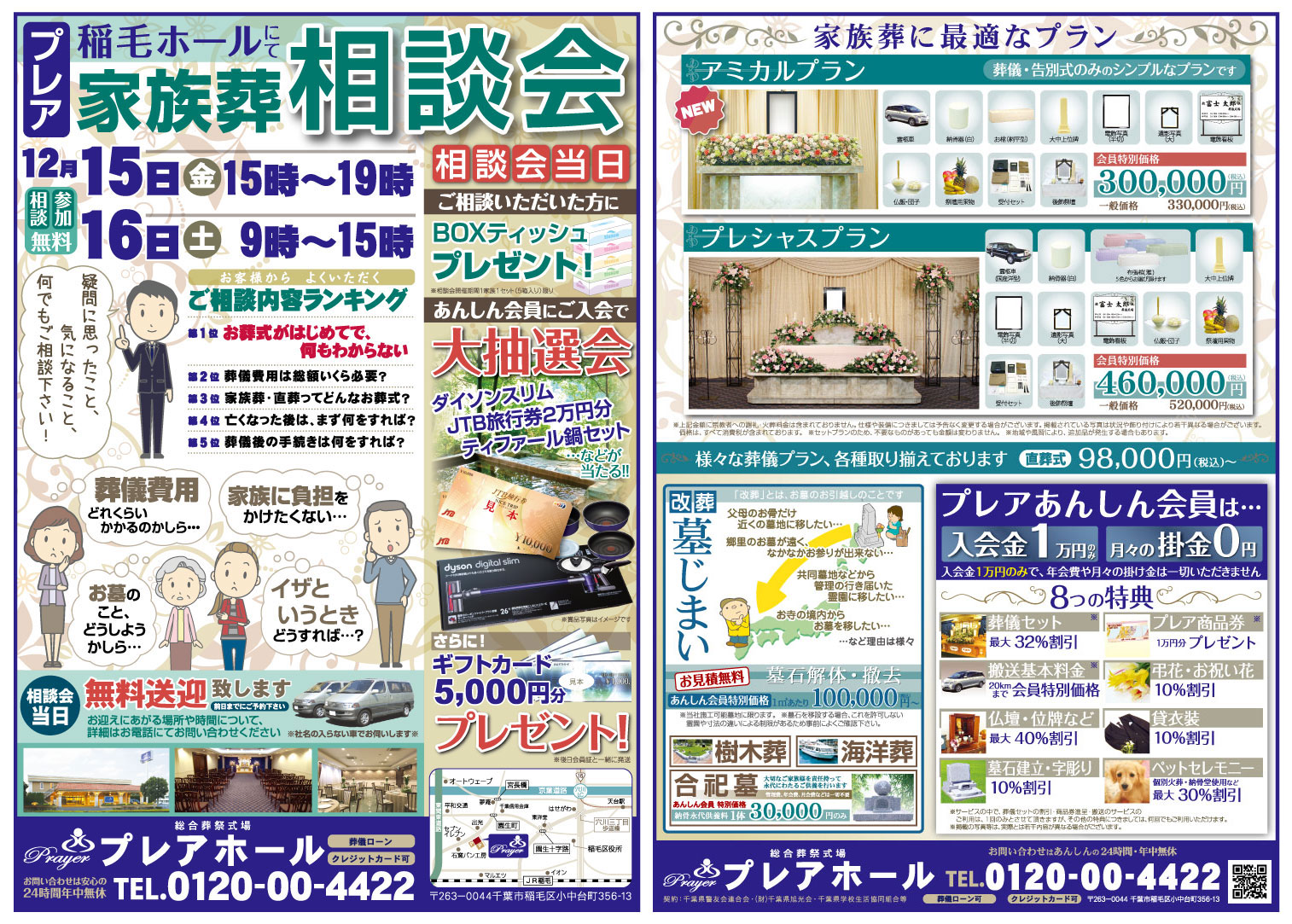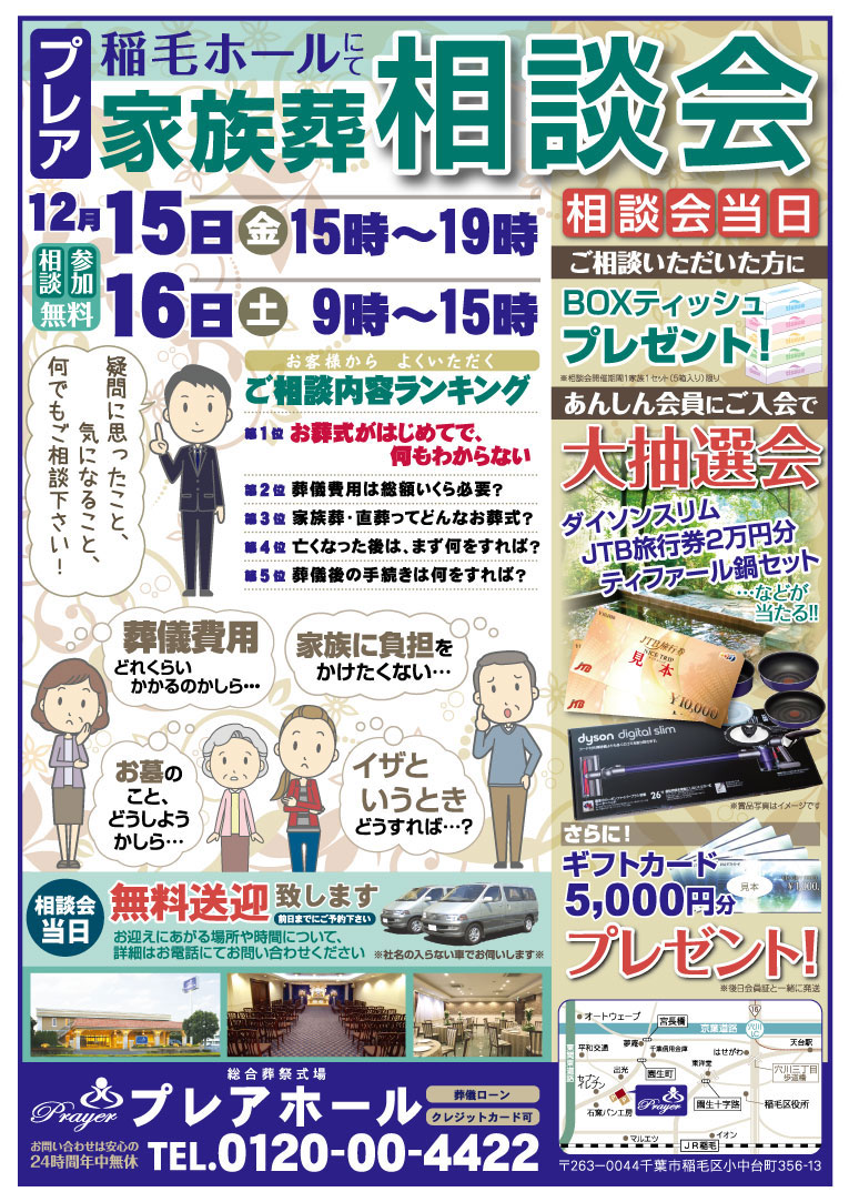 12月15、16日の2日間、プレア稲毛ホールにて家族葬相談会を行います。