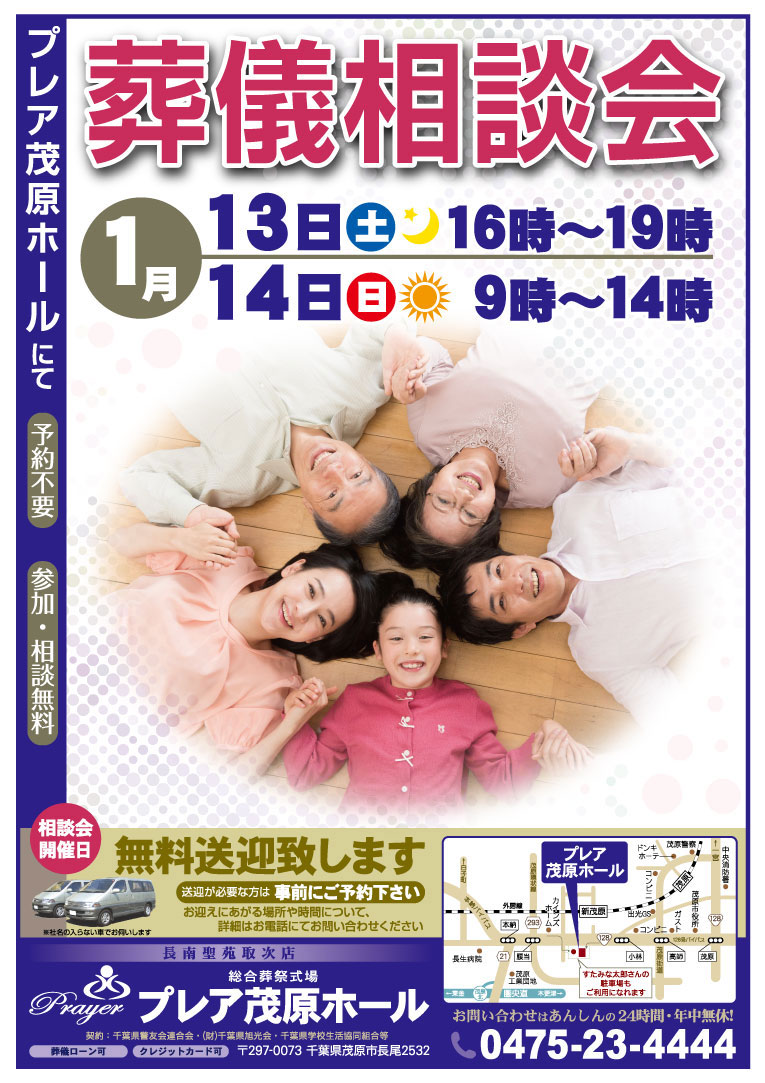 1月13、14日の2日間、プレア茂原ホールにて葬儀相談会を行います。