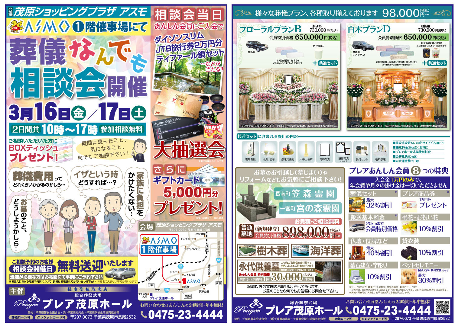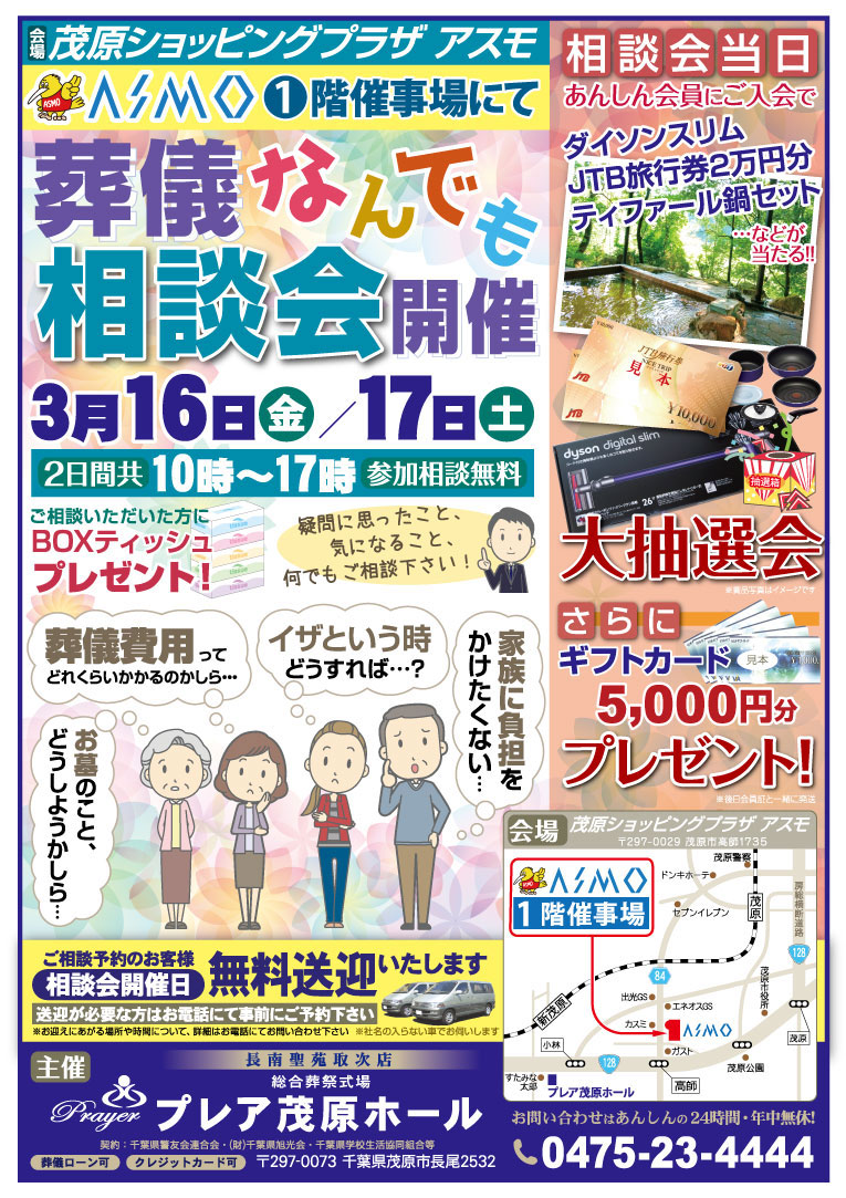 3月16日(金)、3月17日(土)の2日間、茂原ショッピングプラザアスモにて葬儀なんでも相談会を行います。
