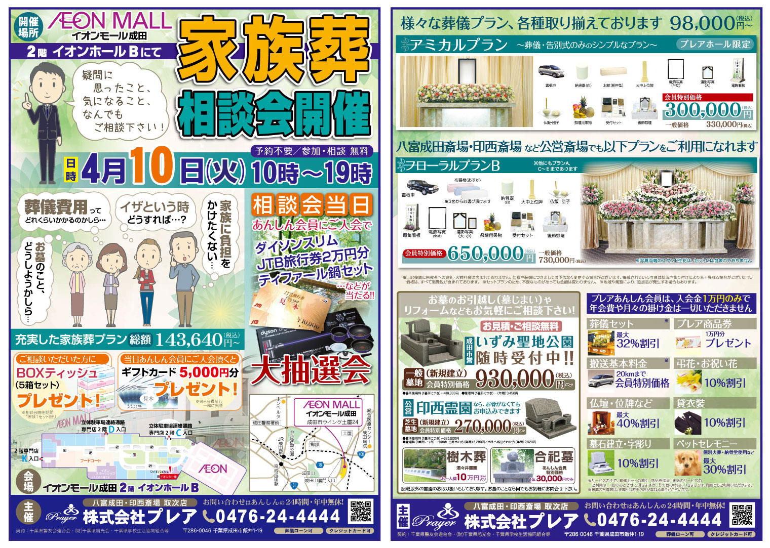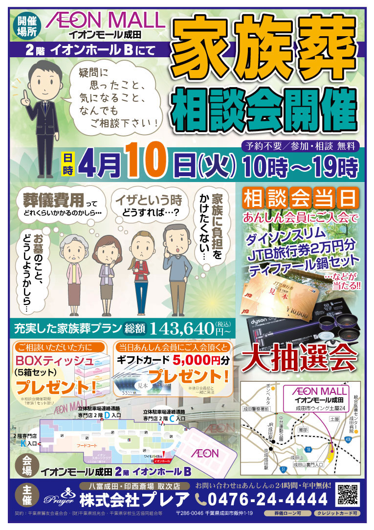 4月10日(火)、イオンモール成田2F、イオンホールBにて家族葬相談会を行います。