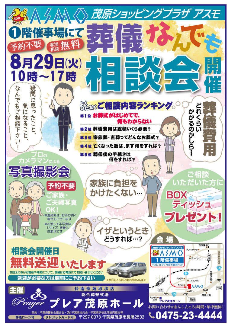 8月29日、茂原ショッピングプラザアスモ1階催事場にて、葬儀なんでも相談会を行います!