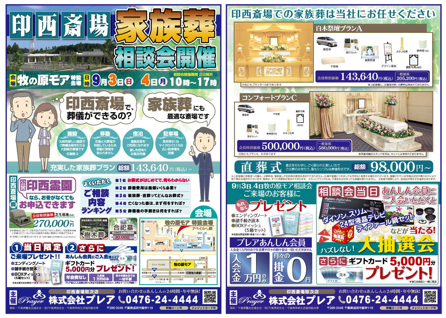 9月3日、4日の二日間、印西牧の原モア特設会場にて印西斎場家族葬相談会を行います。