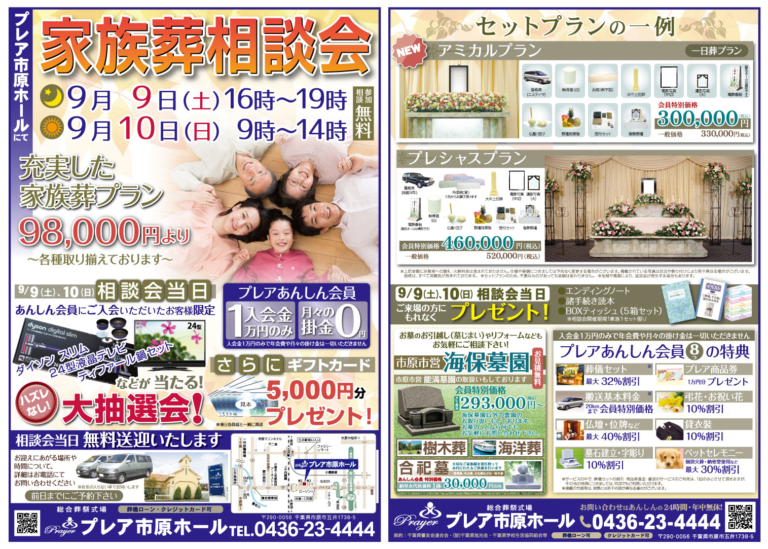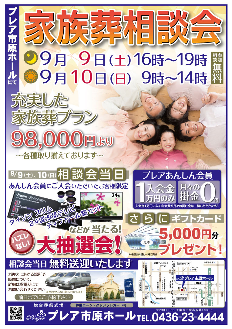 9月9日、10日の二日間、プレア市原ホールにて家族葬相談会を行います。