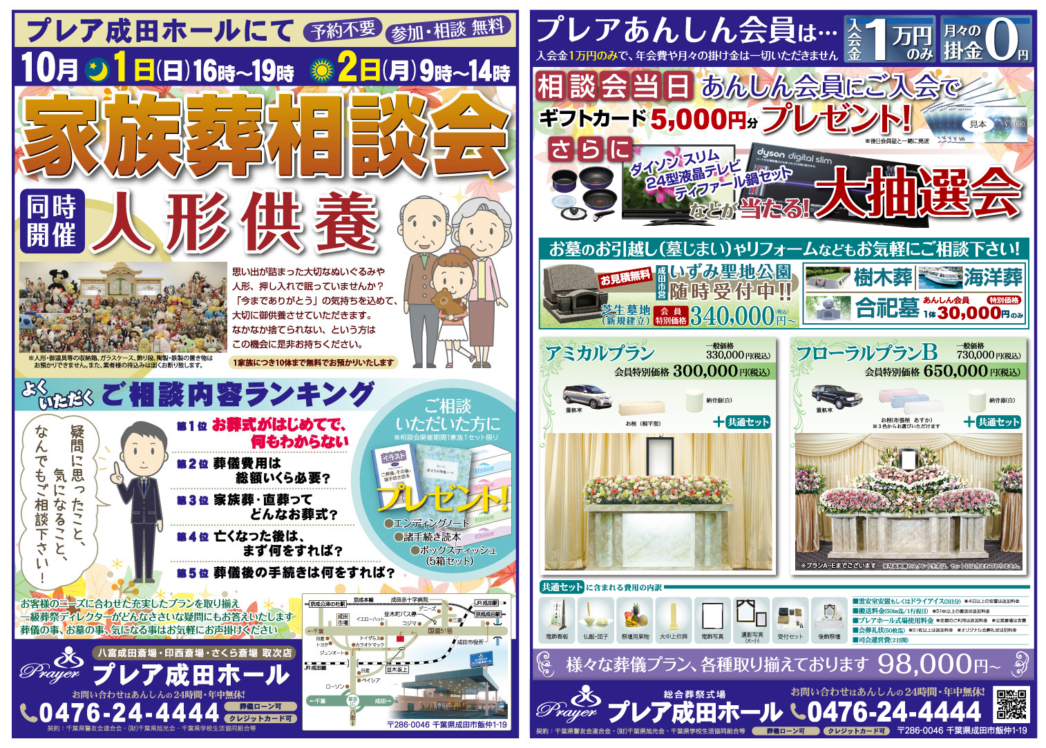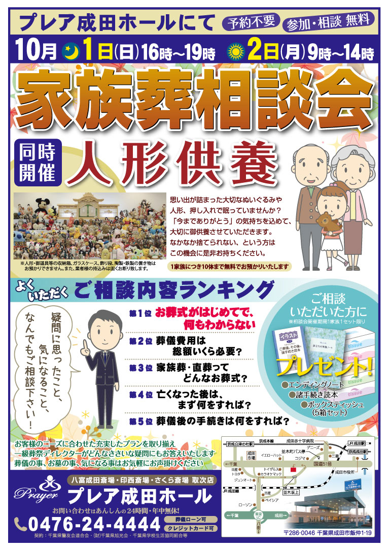 10月1、2日の2日間、プレア成田ホールにて家族葬相談会を行います。
