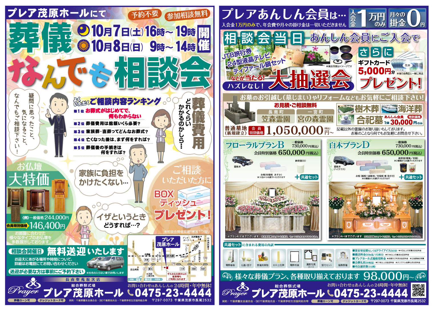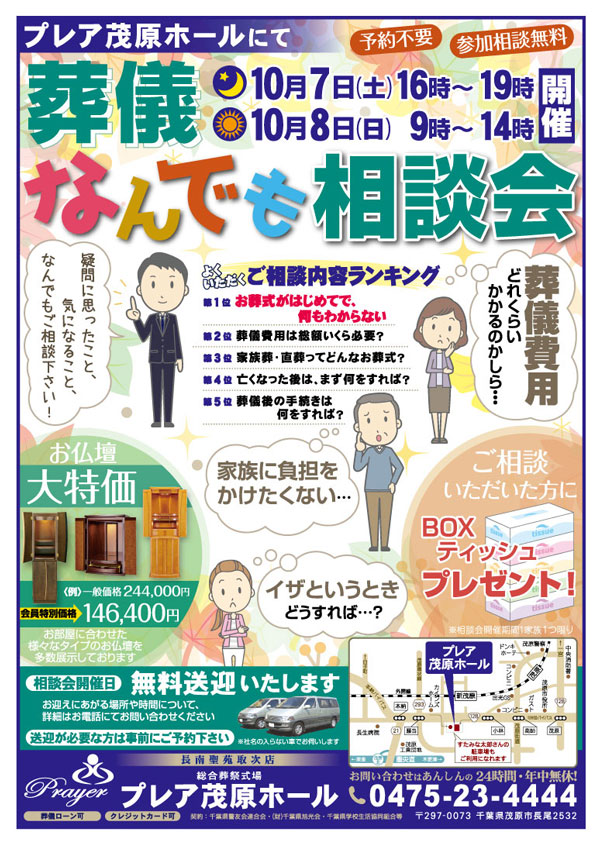 10月7日、8日の二日間、プレア茂原ホールにて“葬儀なんでも相談会”を行います。
