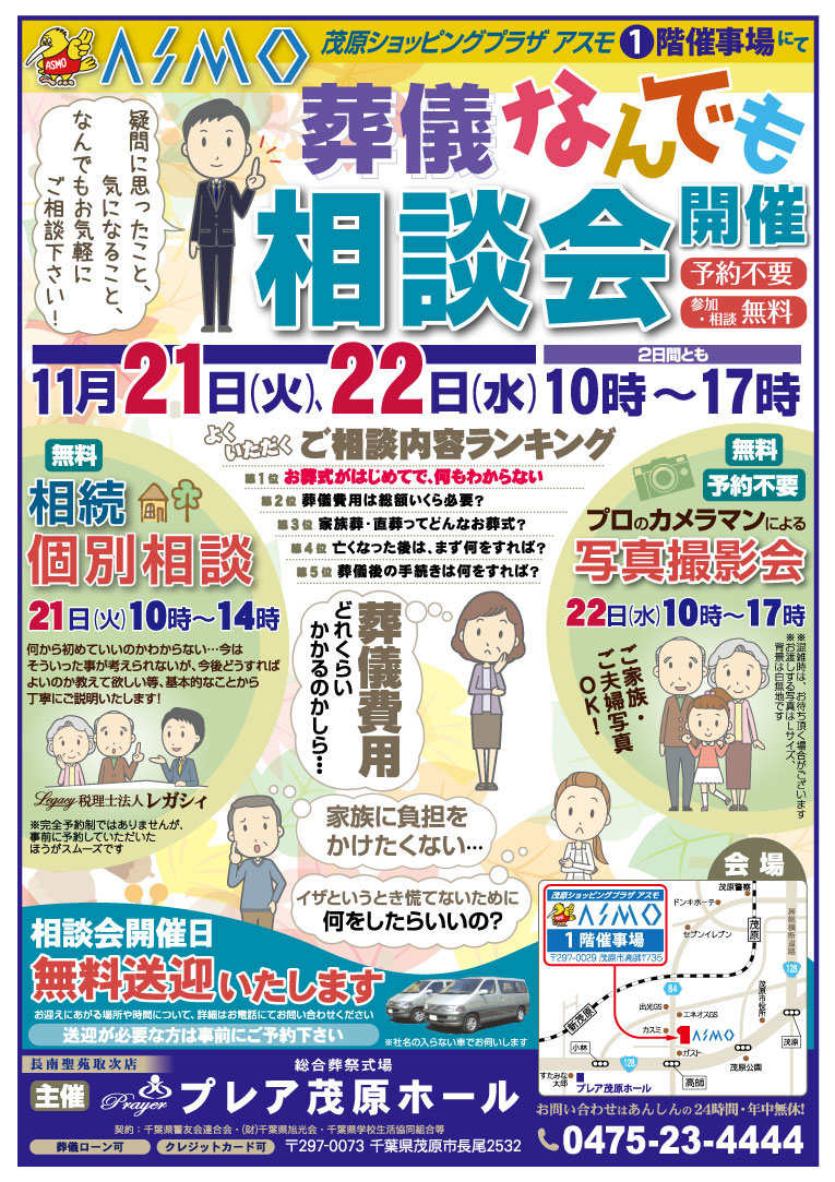 11月21日、22日の二日間、茂原ショッピングプラザアスモ1階催事場にて、葬儀なんでも相談会を行います!