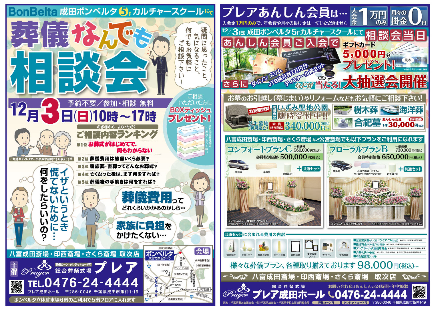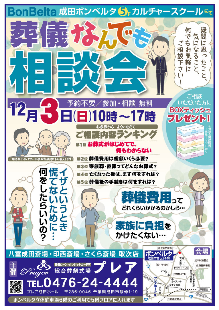 12月3日(日)、成田ボンベルタ5Fカルチャースクールにて葬儀なんでも相談会を行います。