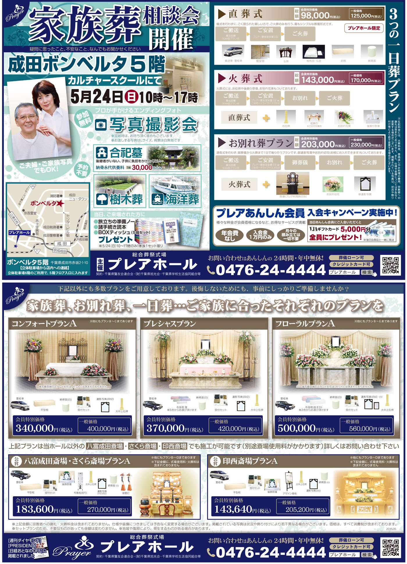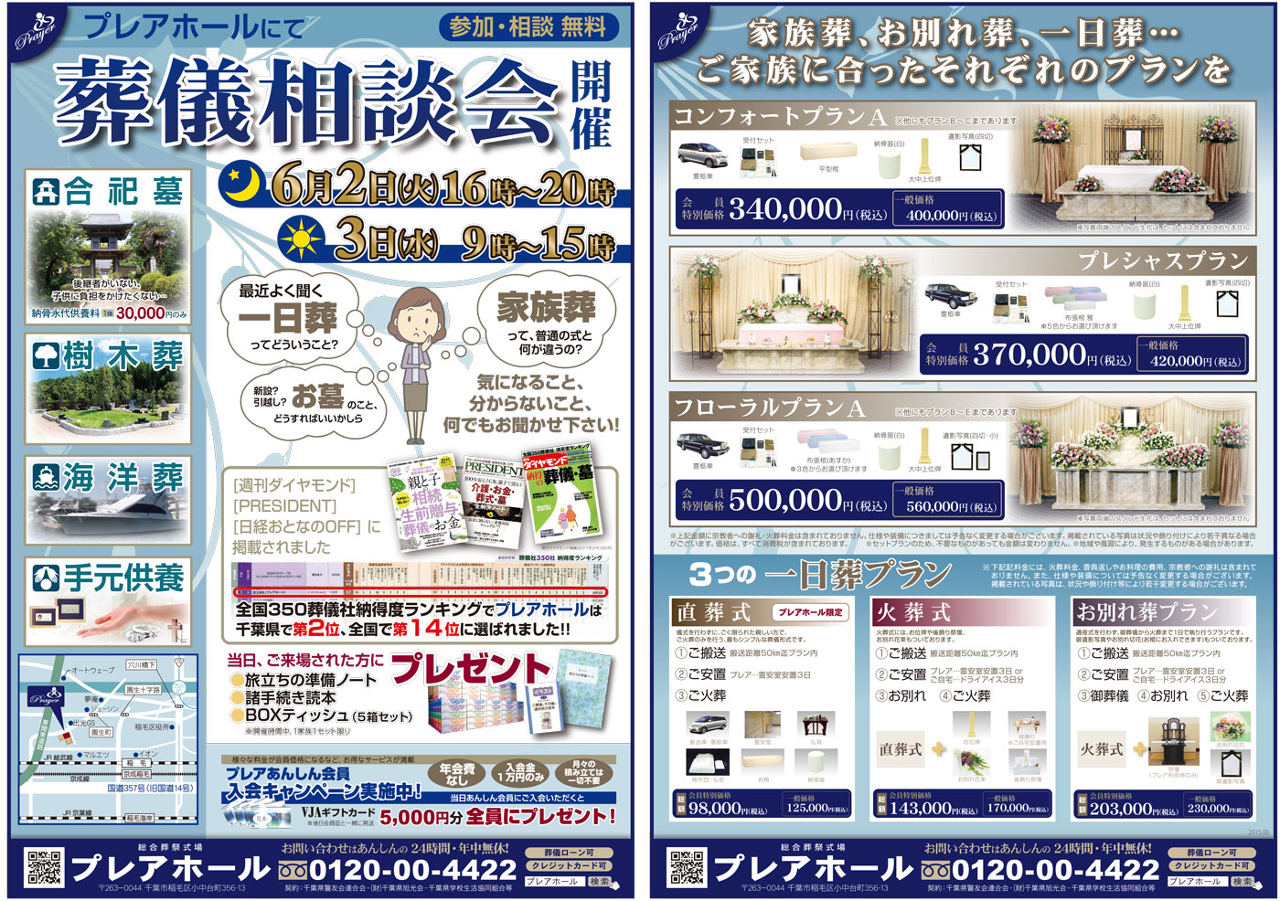 6月2日(火)16:00~20:00、6月3日(水)9:00~15:00の2日間、プレア稲毛ホールにて葬儀相談会を行います。