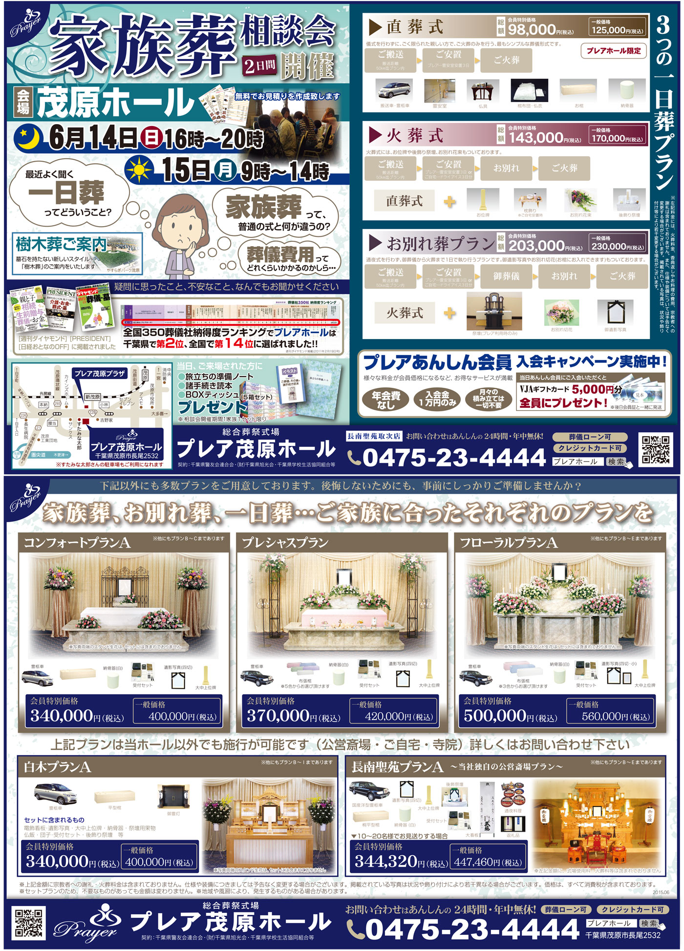 6月14日(日)16:00~20:00、6月15日(月)9:00~14:00の2日間、プレア茂原ホールにて家族葬相談会を行います。