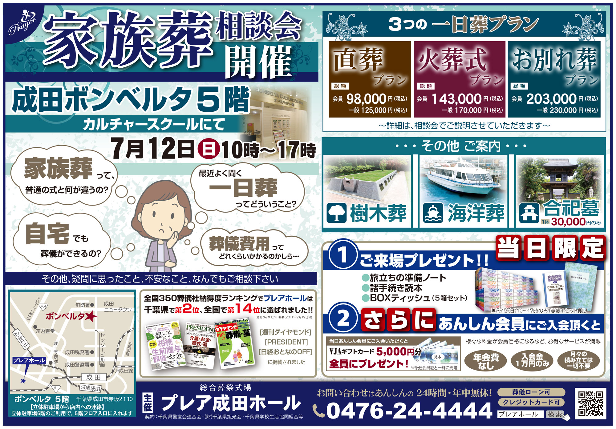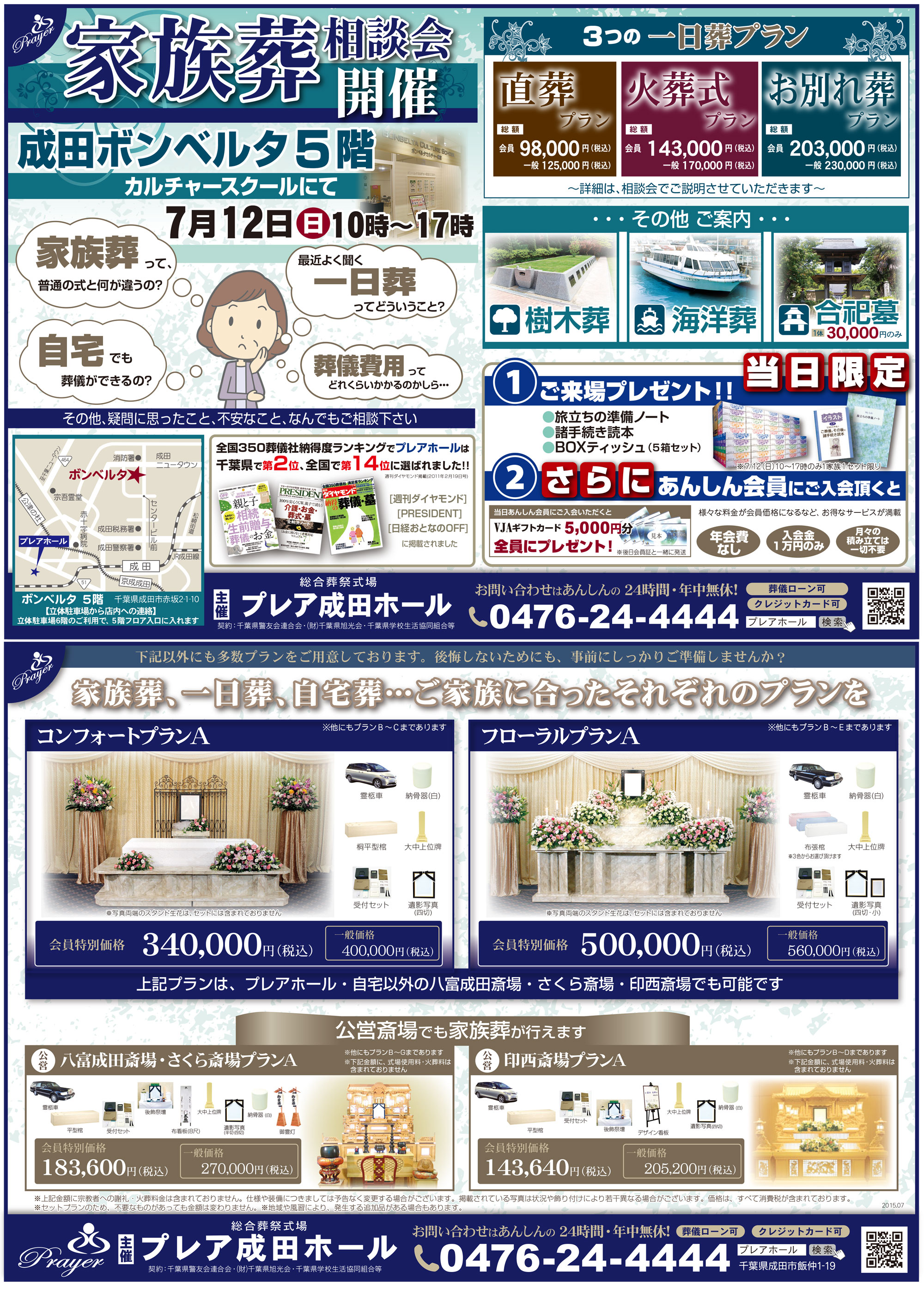 7月12日(日)ボンベルタ5階カルチャー教室にて家族葬相談会開催。当日ご来場された方には、親と子の相続生前贈与葬儀のお金(終活ノート付)&BOXティッシュをプレゼント!最近話題の樹木葬や海洋葬、合祀墓のご案内をいたします。後継者がいなくてお墓は…と言う方に必見です!是非ご相談くださいませ。もちろん葬儀の相談窓口もご用意しておりますので、どんなささいなことでも一級葬祭ディレクターがお客様のご要望・ご予算に合わせたプランをご提案致します。