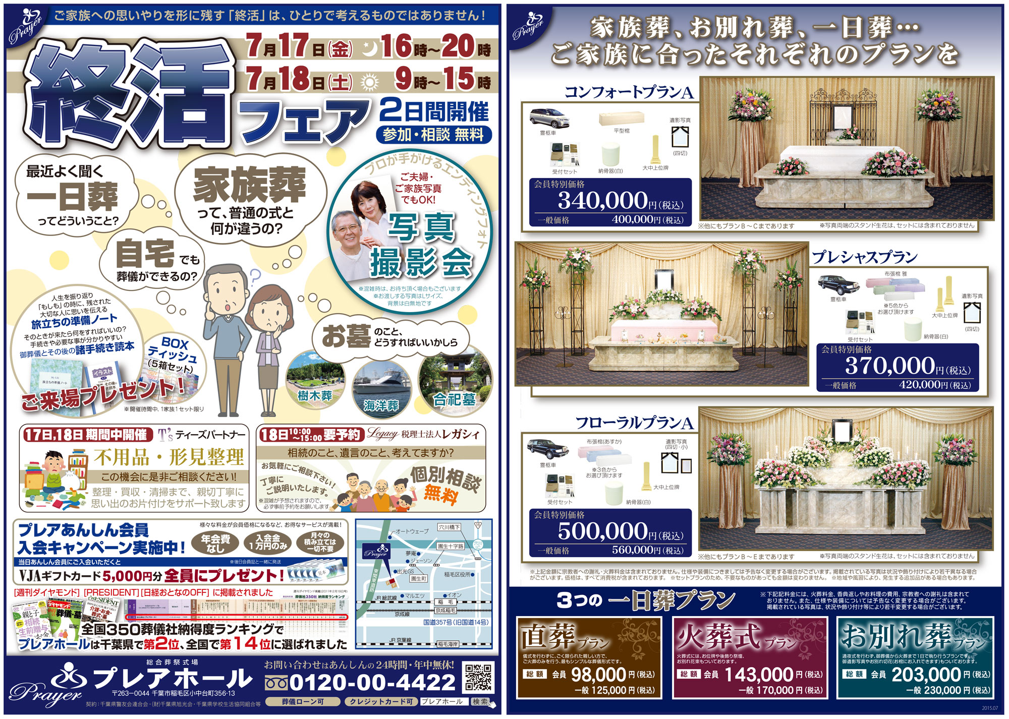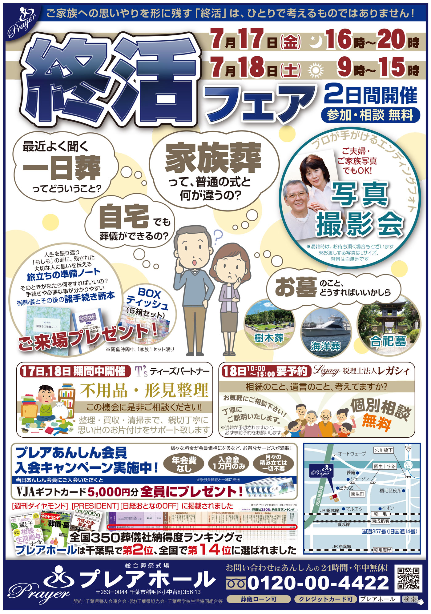7月17日(日)16:00~20:00、7月18日(月)9:00~15:00の2日間、プレア稲毛ホールにて終活フェアを行います。