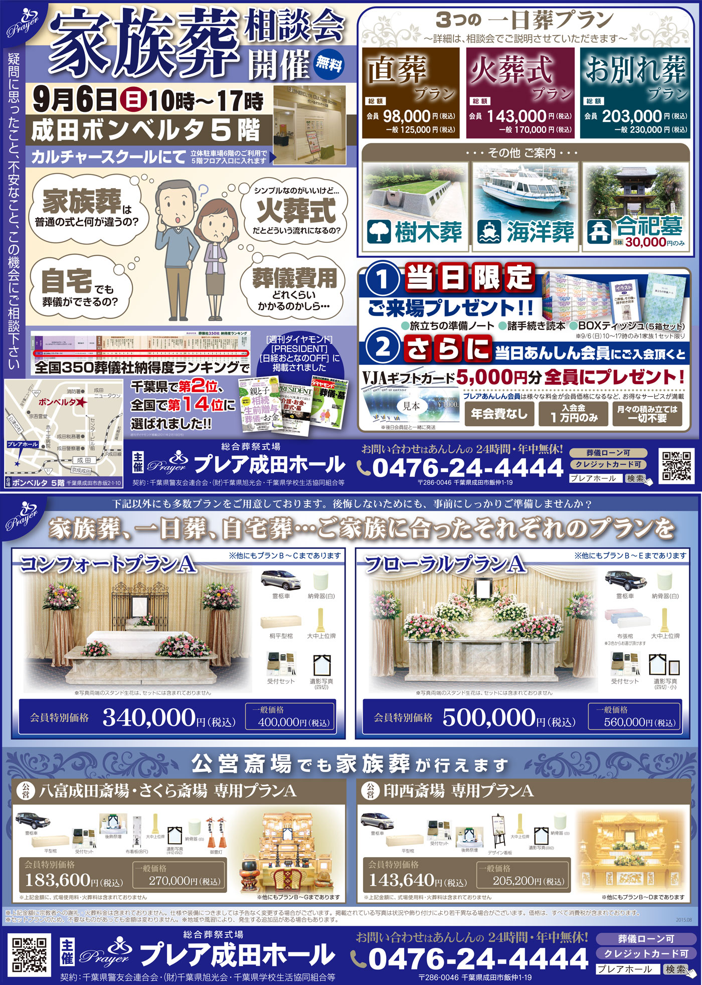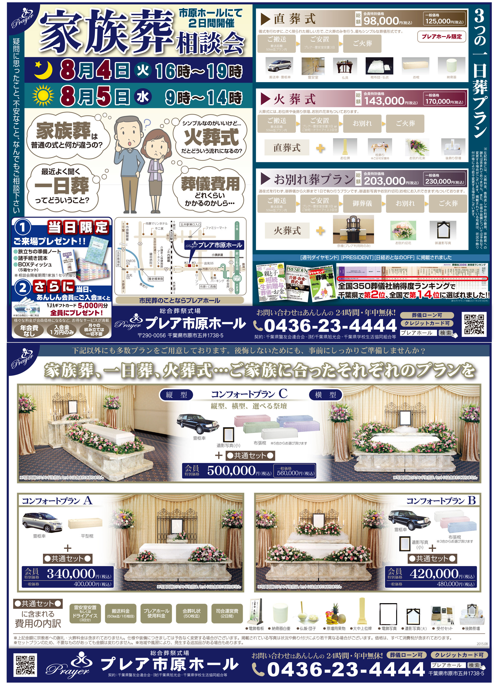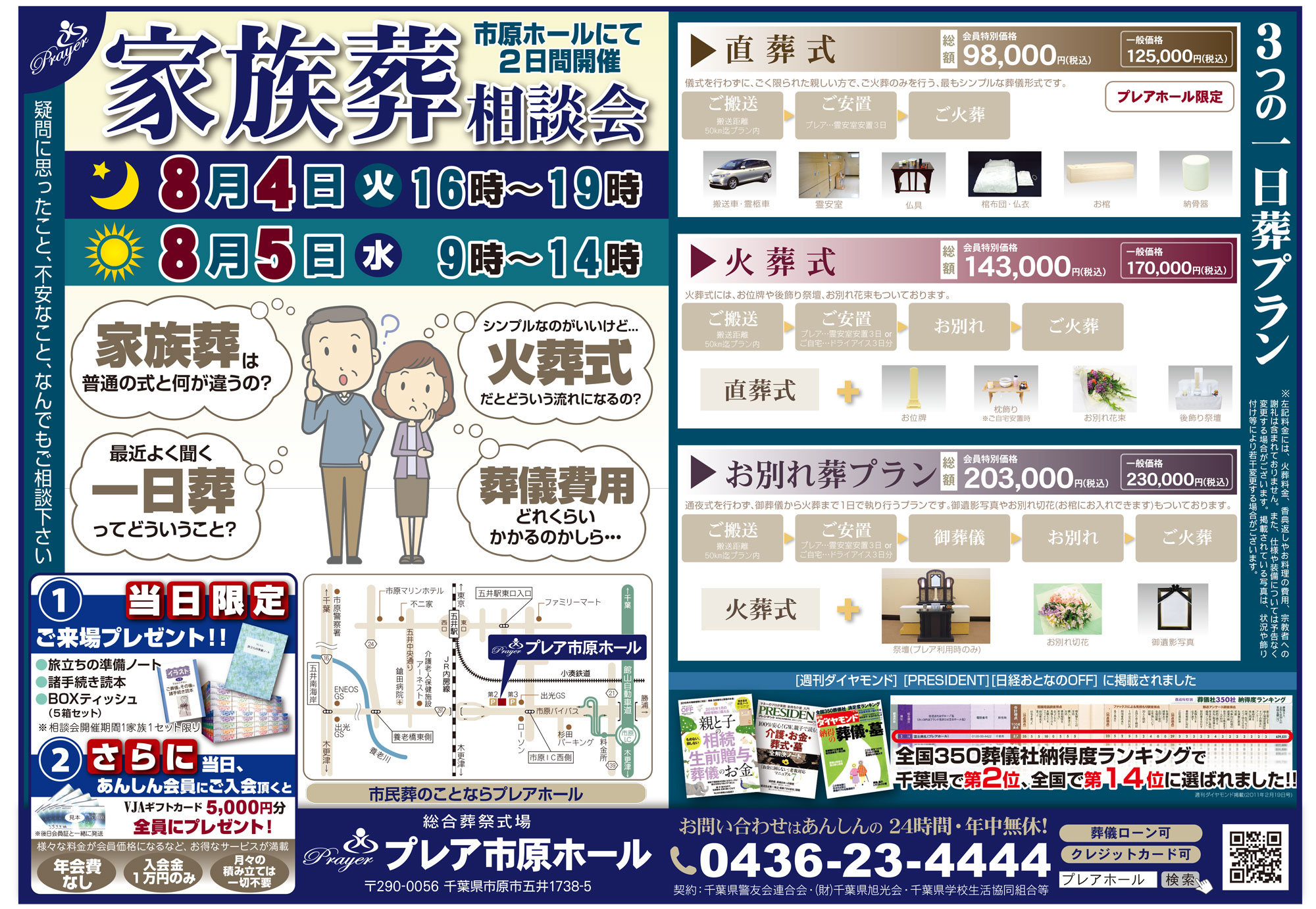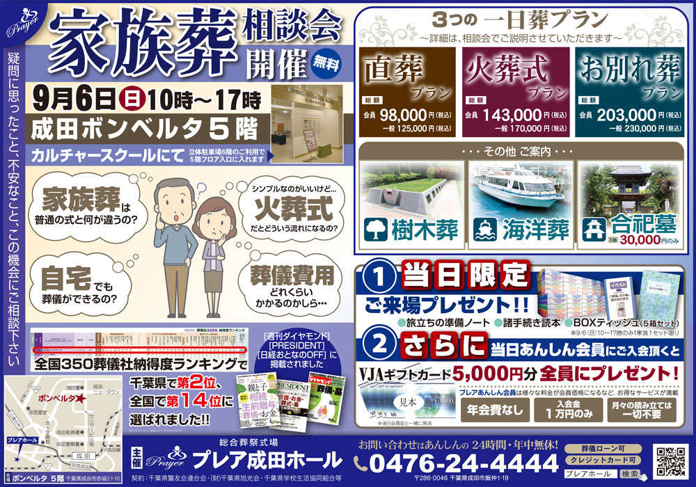 8月4日(火)16:00~19:00、8月5日(水)9:00~14:00の2日間、プレア市原ホールにて家族葬相談会を行います。