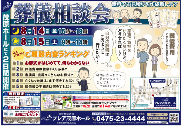 8月14日(金)15:00~19:00、8月15日(土)9:00~14:00の2日間、プレア茂原ホールにて葬儀葬相談会を行います。