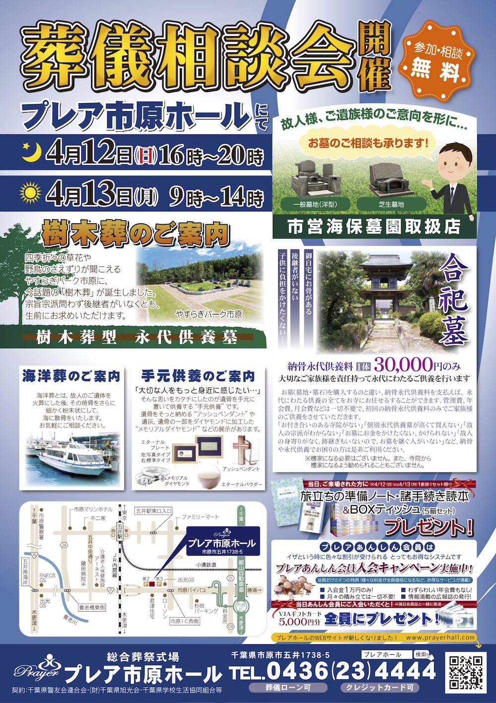4月12日(日)16:00~20:00、4月13日(月)9:00~14:00の二日間、プレア市原ホールにて葬儀相談会を行います。当日ご来場された方には「旅立ちの準備ノート」「諸手続き読本」&BOXティッシュをプレゼント!最近話題の樹木葬や合祀墓のご案内をいたします。後継者がいなくてお墓は…と言う方に必見です。その他にも、海洋葬、手元供養、通常墓地のご相談も承っておりますので、お気軽にご相談くださいませ。皆様のお越しをスタッフ一同お待ちしております。