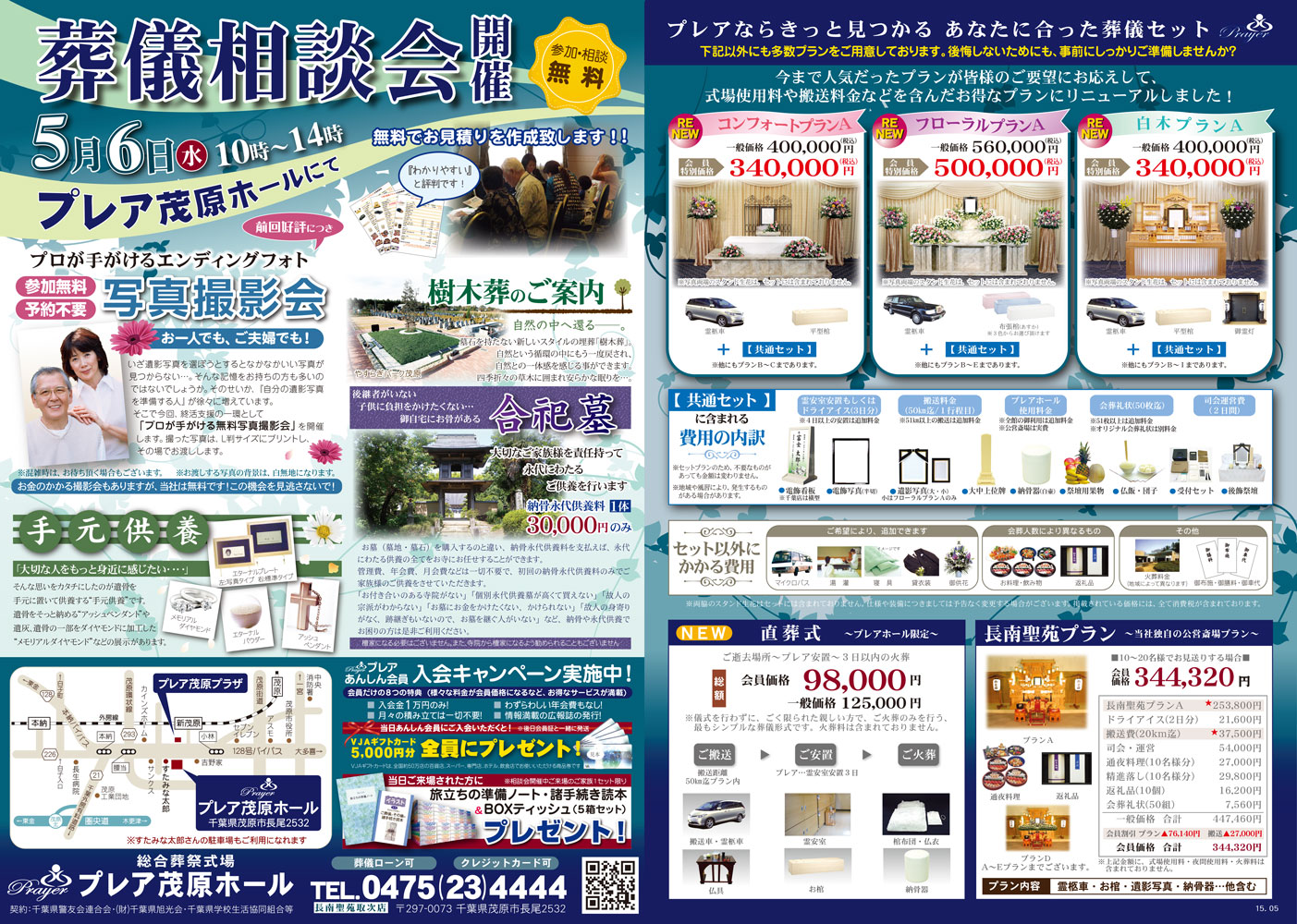 5月6日(水・祝)プレア茂原ホールにて相談会開催。時間は10時~14時まで。当日ご来場された方には、旅立ちの準備ノート・諸手続き読本&BOXティッシュをプレゼント!プロが手がける無料写真撮影会や最近話題の樹木葬や合祀墓、また手元供養のご案内をいたします。