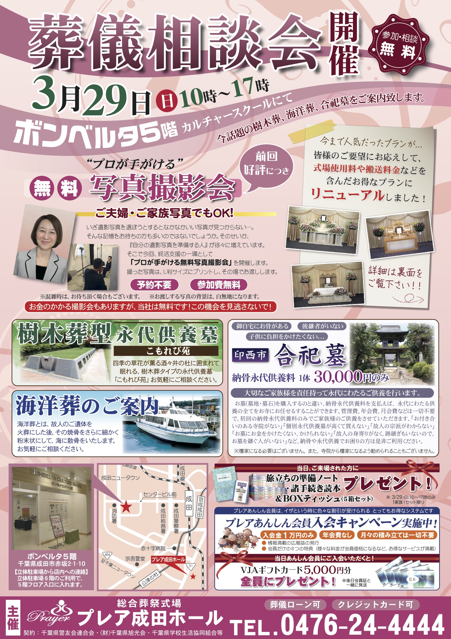 3月29日(日)ボンベルタ5階カルチャー教室にて相談会を行います。時間は10時~17時まで。当日ご来場された方には、旅立ちの準備ノート・諸手続き読本&BOXティッシュをプレゼント!プロが手がける無料写真撮影会や、最近話題の樹木葬や海洋葬、合祀墓のご案内をいたします。後継者がいなくてお墓は…と言う方に必見です!是非ご相談くださいませ。もちろん葬儀の相談窓口もご用意しておりますので、どんなささいなことでも一級葬祭ディレクターがお客様のご要望・ご予算に合わせたプランをご提案致します。皆様のお越しをスタッフ一同お待ちしております。