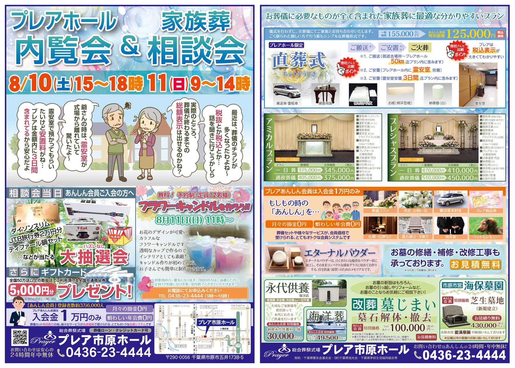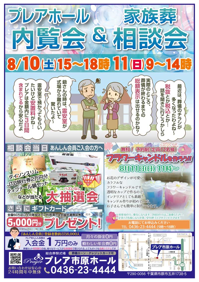8月10日(土)、11日(日)の二日間、プレア市原ホールにてプレアホール内覧会&家族葬相談会を行います。