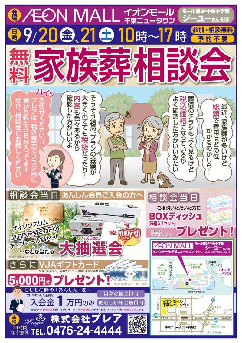 9月20日(金)、21日(土)の二日間、イオンモール千葉ニュータウンにて家族葬相談会を行います。