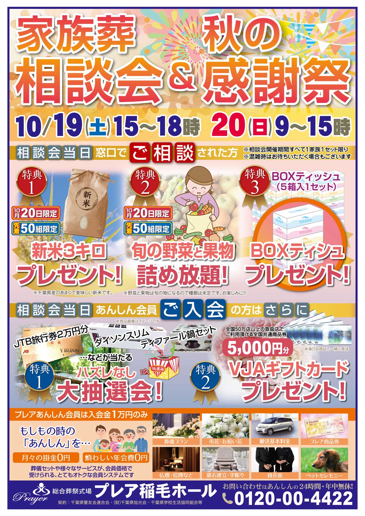 「2日目の10月20日に、ご来場しご相談された先着50組様限定」で【千葉の新米3キロ】、【旬の野菜と果物詰め放題】、【BOXティッシュ5箱】をプレゼント致します!また、「あんしん会員」にご入会された方対象の大抽選会も開催!ダイソンの掃除機やJTB旅行券2万円分等が当たるハズレ無しの大抽選会ですので、この機会に是非ご参加ください!