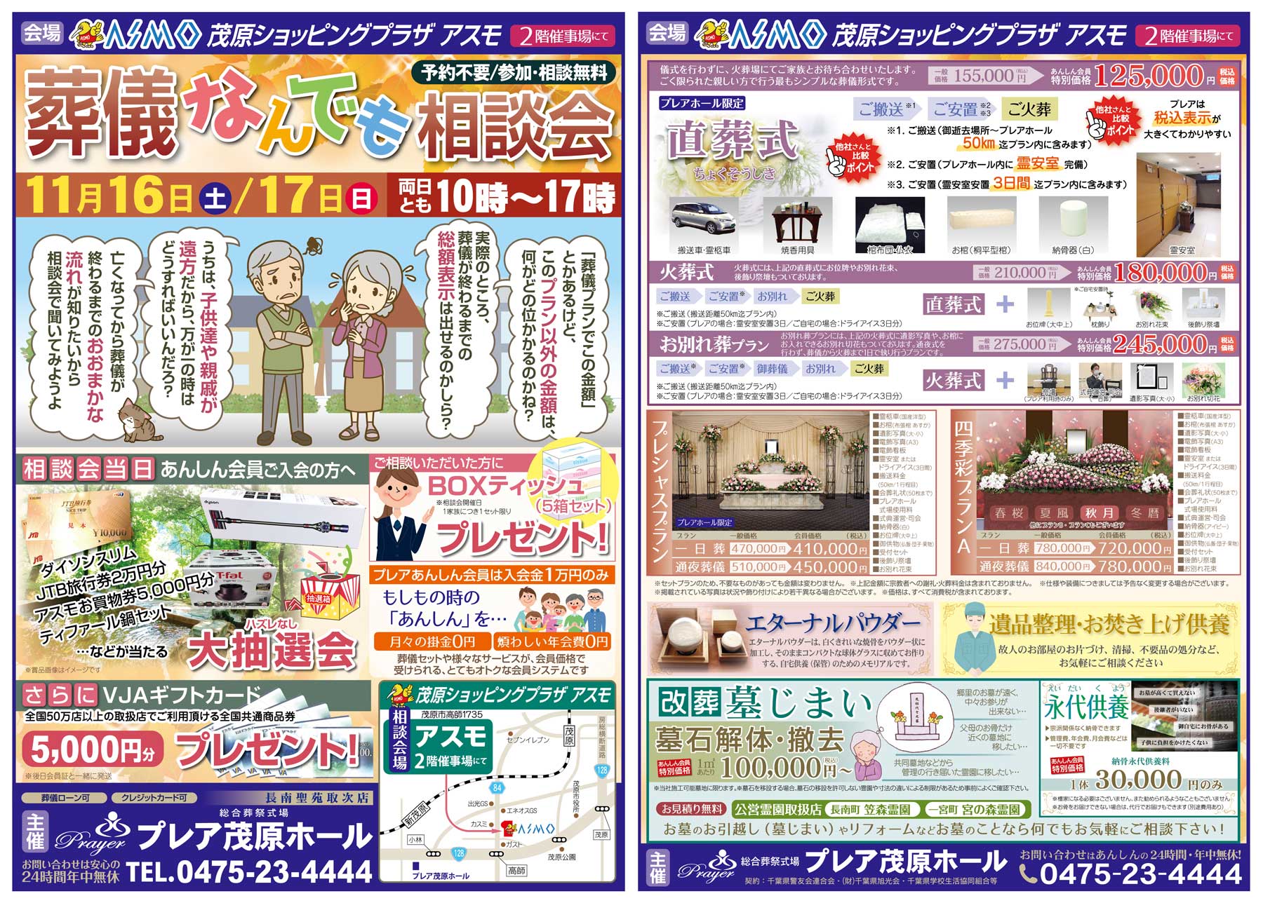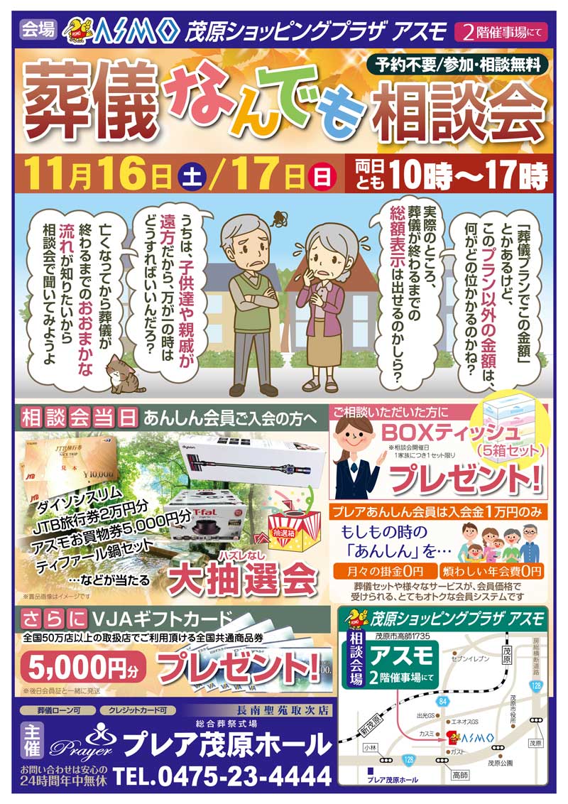11月16日(土)、17日(日)の二日間、茂原ショッピングプラザアスモ2階催事場にて葬儀なんでも相談会を行います。