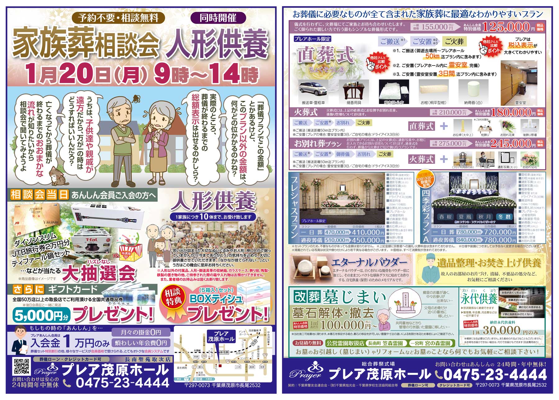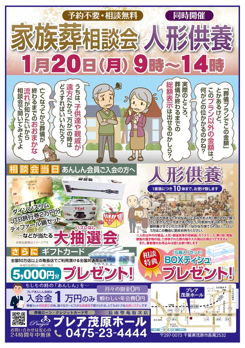 1月20日(月)、プレア茂原ホールにて家族葬相談会と人形供養を開催します。