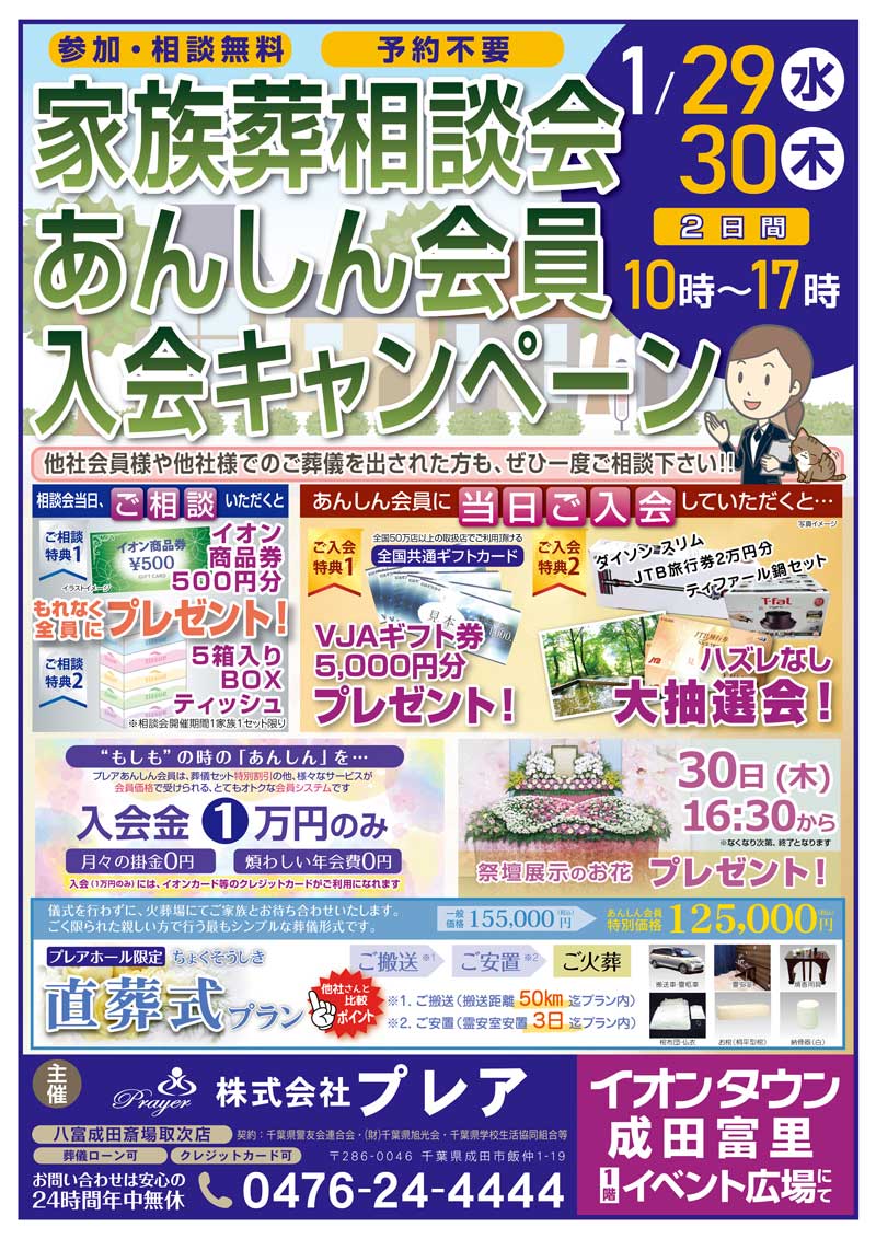 1月29日(水)、30日(木)の二日間、イオンタウン成田富里(1Fイベント広場)にて家族葬相談会あんしん会員入会キャンペーンを行います。