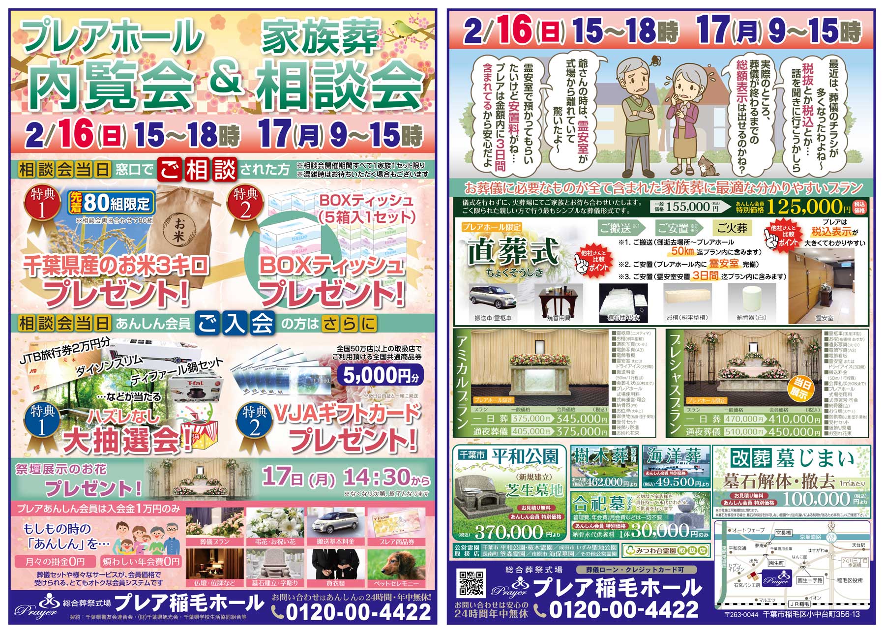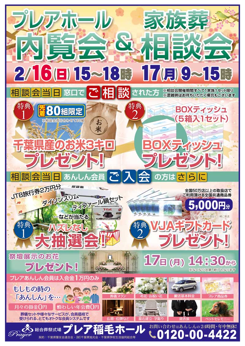 2月16日(日)、17日(月)の二日間、プレア稲毛ホールにて家族葬相談会を行います。