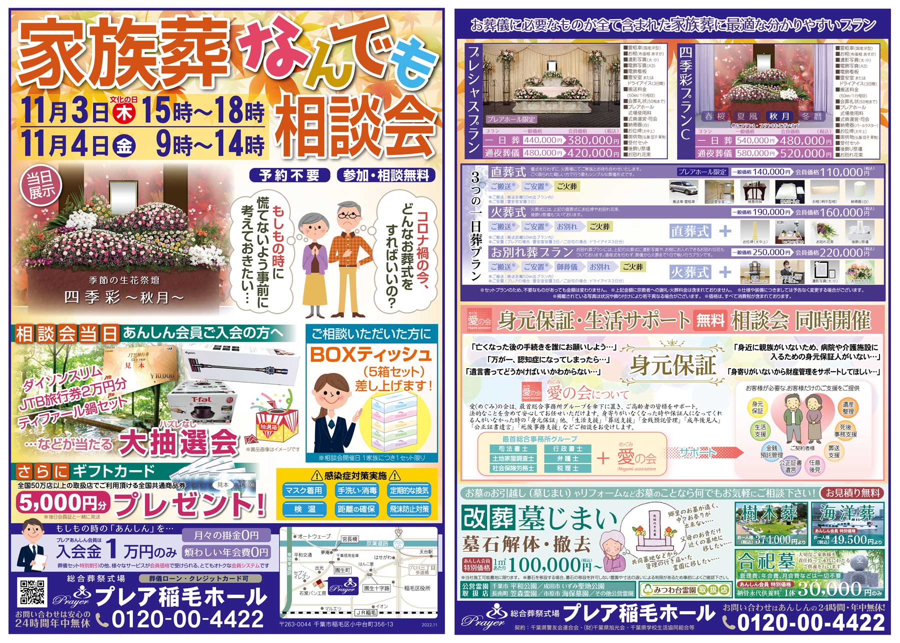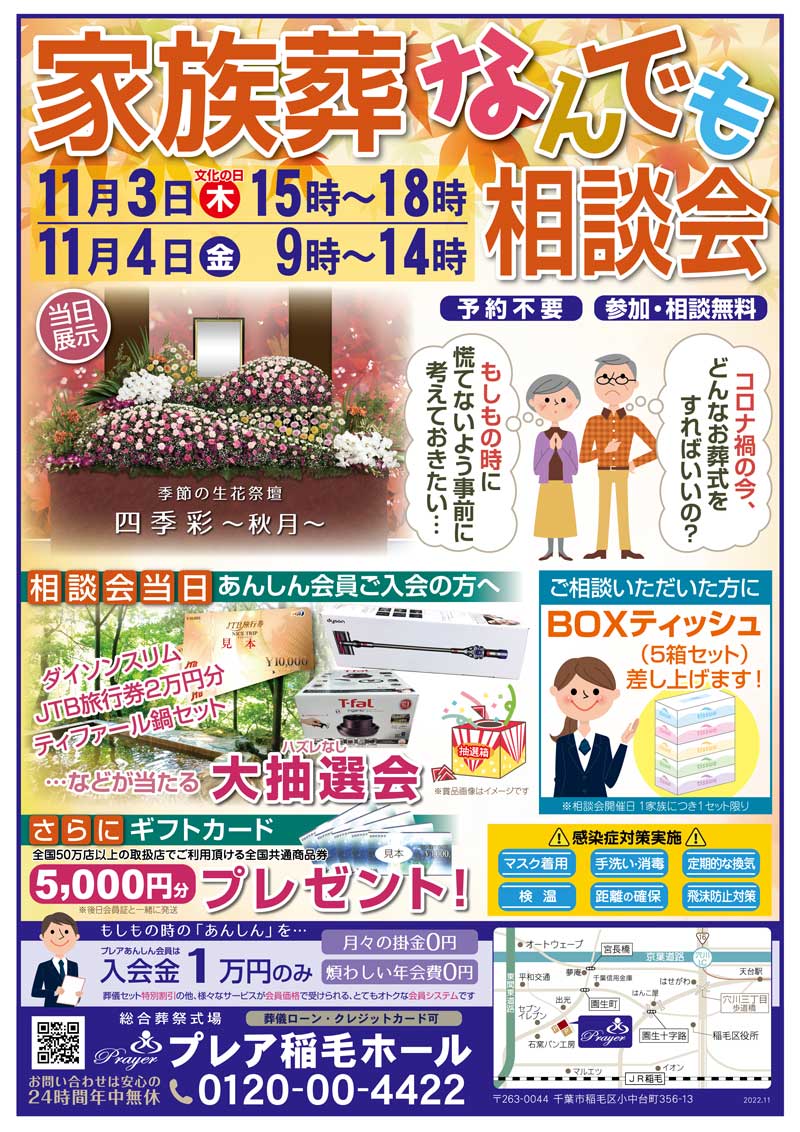 11月3日(木祝)、4日(金)の二日間、プレア稲毛ホールにて“家族葬なんでも相談会”を行います。